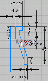![]() [回転]ダイアログが表示されます。[形状]領域の[軸]がアクティブになっています。 回転の中心軸として、左図の線を選択します。 |