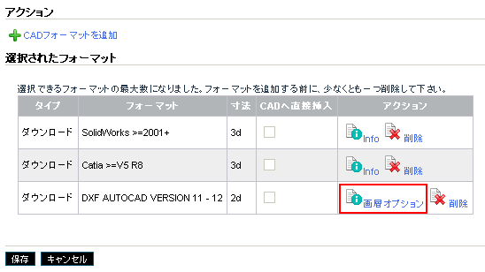 Several options are available for DXF and DWG formats, like layer name and color.