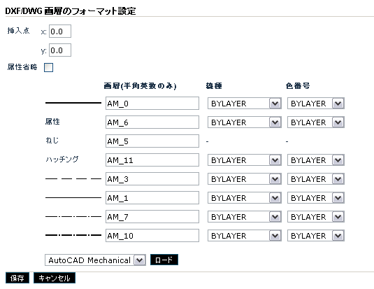 Here, layer names, line types and colors can be specified for each entity. Layer name should be 1-byte alphanumeric character. Line type and color can be specified from the drop-down menu.